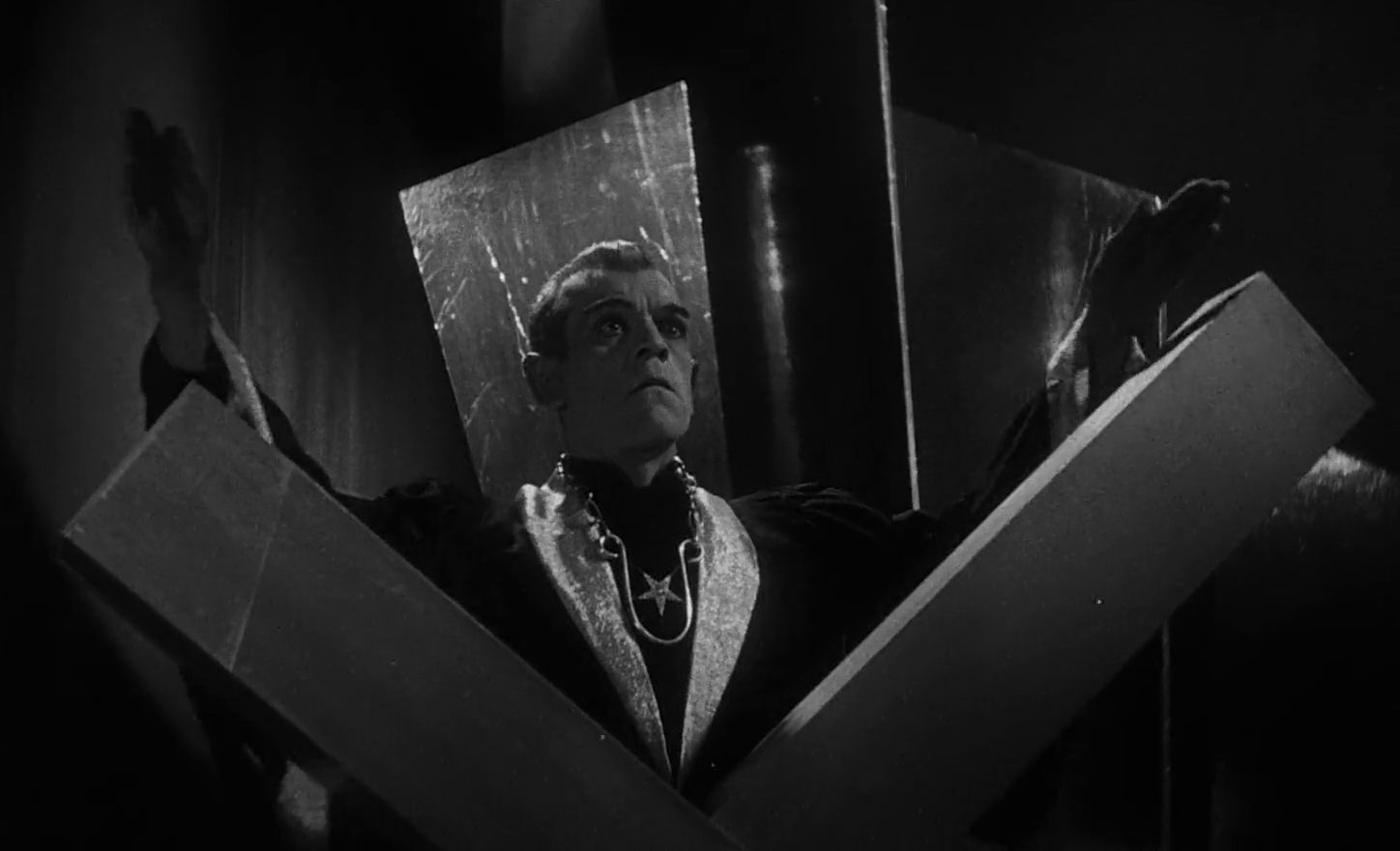 The first screen pairing of Boris Karloff with Bela Lugosi is a highly-stylized combination of expressionist sets and baroque Horror. Complicated story is partly because Universal Studios cut the film drastically, but a lot of flavor is packed into the remaining 65minutes. Amusing characters, inventive direction, odd sets, the suggestion of strong violence and some of the most unique scenes in Horror movie history. One of the single greatest images to come from this period is a collection of dead women hovering in glass cases. Karloff’s character is based on British satanist Aleister Crowley.